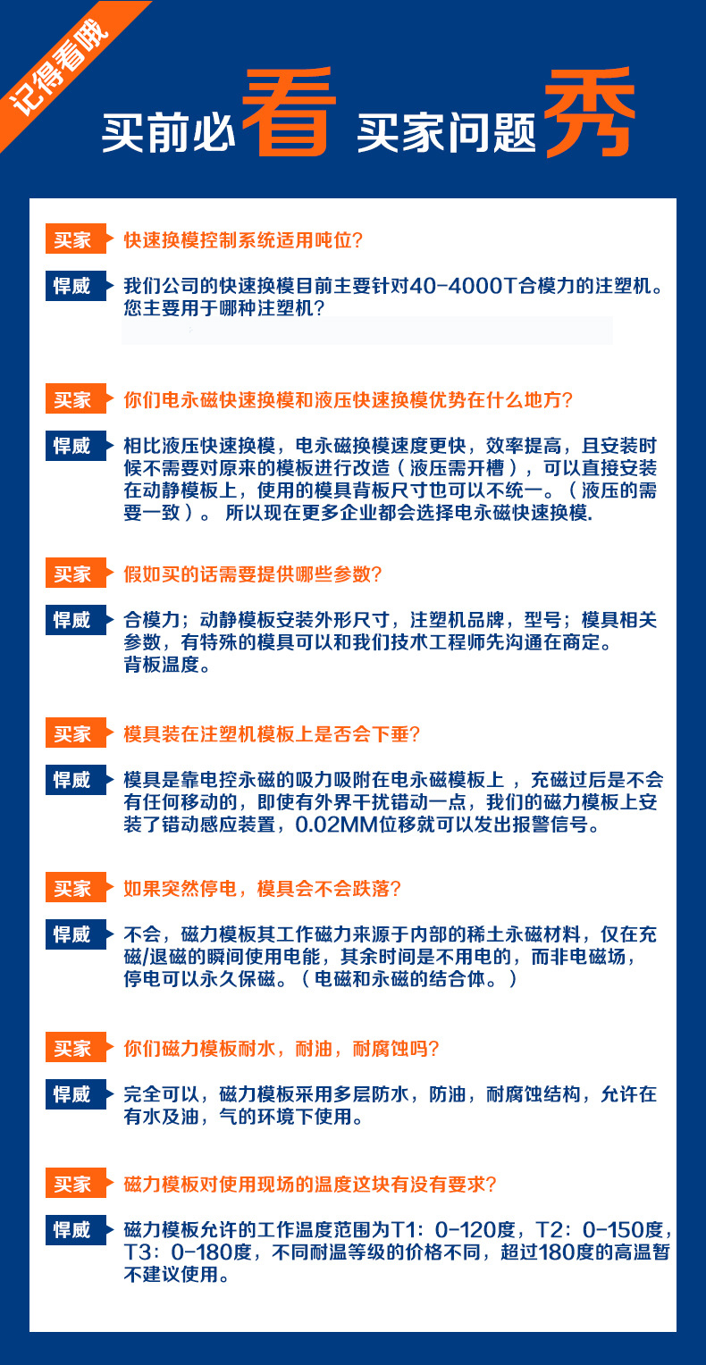 悍威磁電有多年從事電永磁相關產品研制的經驗,其電永磁快速換模系統完全按照國際標準設計制造,精益求精,整套系統的性能、質量和安全保護裝置毫不遜色于國際知名品牌,適用于50噸—3200噸注塑機使用。